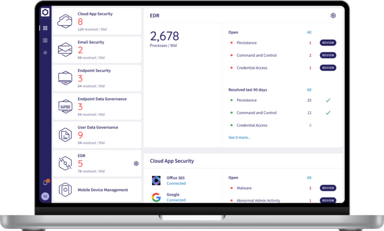 - Cloud Applications: Connects, monitors and controls a range of cloud apps: Microsoft Office 365, Google Workspace, Slack, Dropbox, Box, and Salesforce