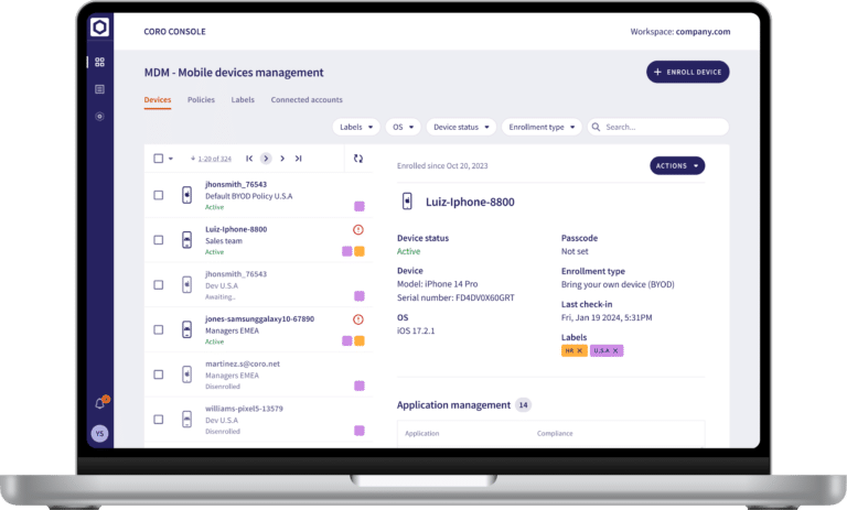 Coro’s Mobile Device Management (MDM) module simplifies the management and security of company-owned and Bring Your Own Device (BYOD) work-related mobile devices. It enables IT teams to enforce app policies, manage apps, and ensure company policy compliance. The module gives visibility into mobile devices, ensuring efficient device management across the organization.