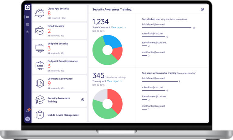 Coro’s Security Awareness Training (SAT) module empowers leadership, employees and contractors with the knowledge and tools to recognize phishing and social engineering attacks. SAT reduces human error and strengthens your cybersecurity posture through real-world phishing simulations and high-quality security awareness training. Using SAT shows that your business has proactively implemented security awareness measures, mitigating legal, financial, insurance, and reputational risks while safeguarding your organization and leadership.