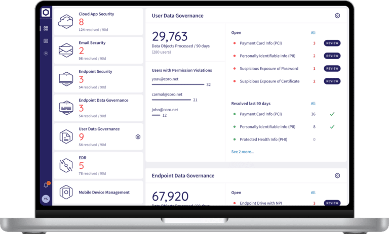 The Coro User Data Governance module enables businesses to detect unauthorized sharing or access of sensitive data. Through continuous monitoring of user behavior and data exposure, it ensures that sensitive data such as personal details, health records, and payment information is only accessible to authorized individuals and compliant with data protection regulations such as GDPR, HIPAA, and PCI-DSS.
