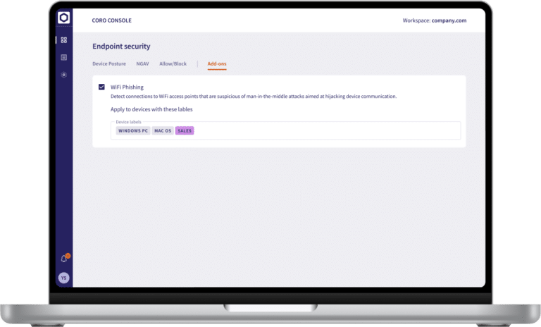 The Coro WiFi Phishing add-on guards endpoints outside the LAN (local area network) by preventing connections to suspicious WiFi access points. It works by detecting connections to WiFi access points that are suspicious of man-in-the-middle attacks aimed at hijacking device communication.
